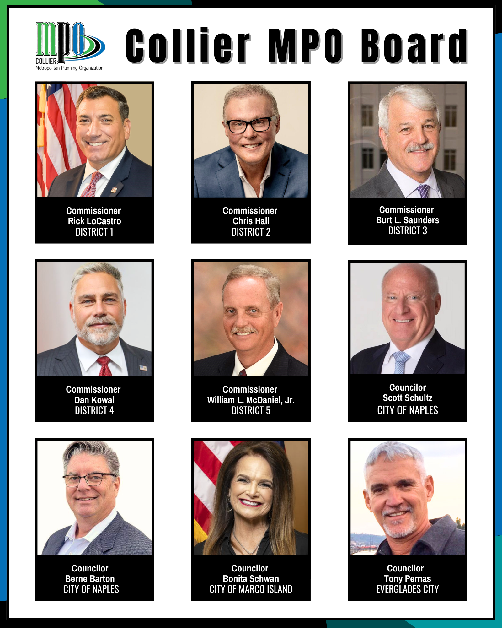 The Metropolitan Planning Organization (MPO) Board is comprised of the five members of the Collier County Board of County Commissioners, two members of the Naples City Council, one member of the Marco Island City Council, one member of the City of Everglades City Council, and one non-voting member from the Florida Department of Transportation (FDOT). The current Chair of the MPO Board is Councilor Tony Pernas and the Vice-Chair is Councilor Bonita Schwann.